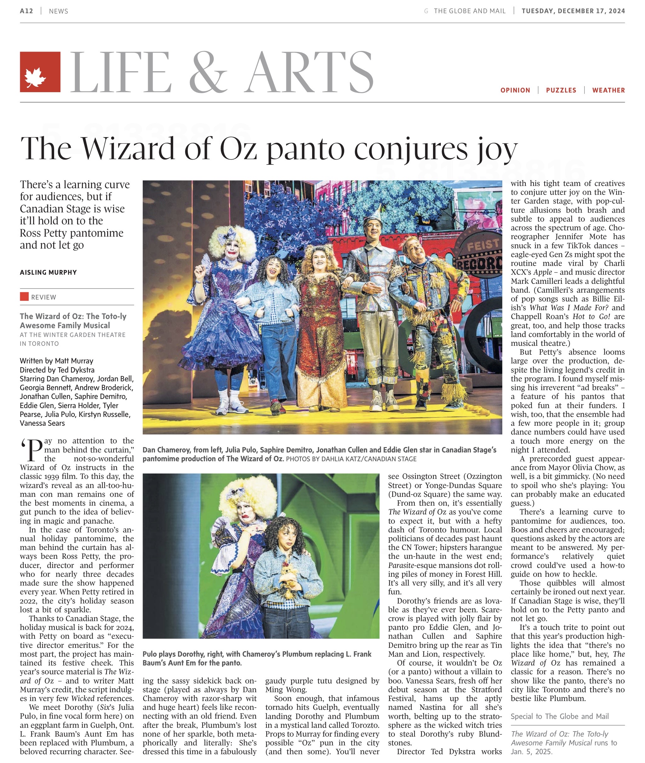 Saturday signifies two conclusions. It’s closing night for “Peter’s Final Flight,” the colourful, irreverent Christmas panto at the Elgin Theatre on Yonge Street. Closing nights tend to be tinged with sadness regardless of context, but the last bow of “Peter’s Final Flight” doesn’t just signal the end of the run. At least for now, it represents the end of an era in Toronto theatre, a pause to the Christmas panto tradition until another theatre company can assume the responsibility of producing the mammoth show.